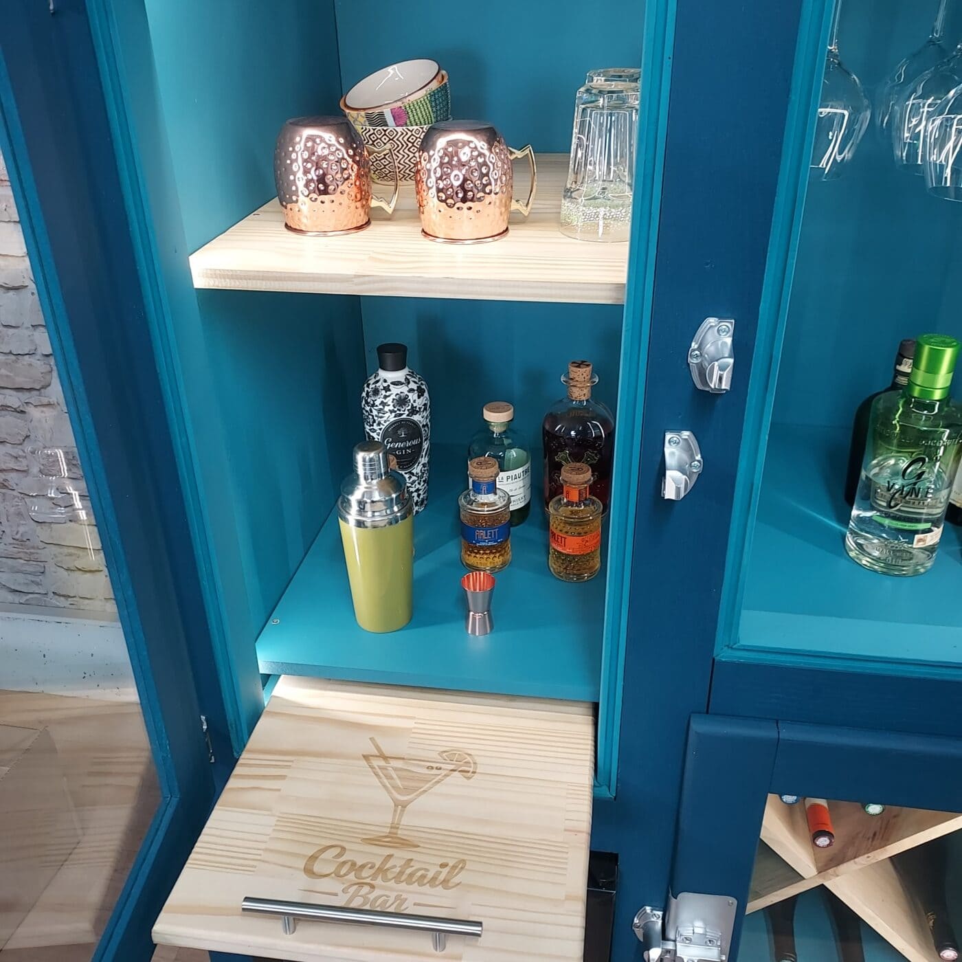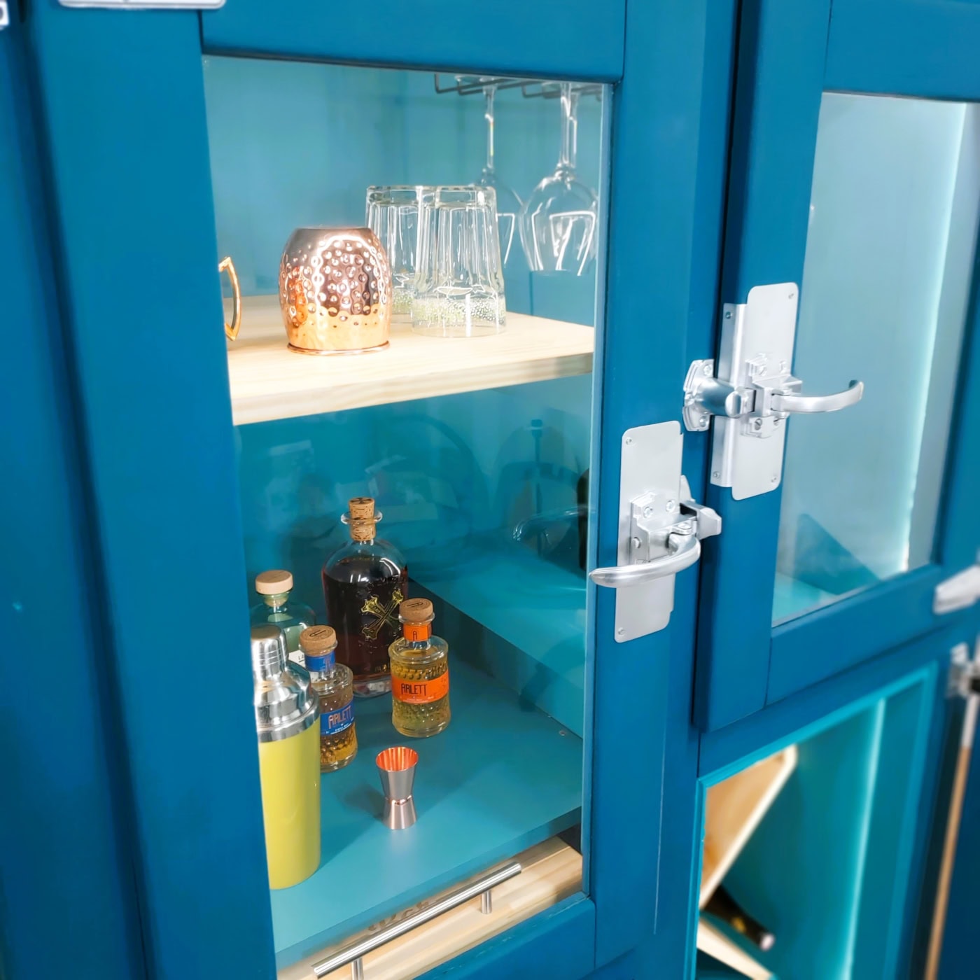 L’abus de style est recommandé, à consommer sans modération ! Cet ancien frigo en bois renaît sous la forme d’un meuble-bar unique, entièrement repensé à partir d’un appareil ancien dont le système de refroidissement hors service a été retiré avec soin. L’intérieur a été réorganisé en trois espaces distincts : un rangement dédié aux bouteilles de vin, un véritable mini-frigo intégré pour les boissons fraîches, et un étage supérieur pensé pour accueillir bouteilles et verres. Trois racks à verres sont fixés sous la partie haute, tandis que plusieurs plateaux structurent l’espace. Une planche de préparation à cocktail montée sur rail se déploie facilement. Les portes, habillées de verre sur mesure, laissent entrevoir l’intérieur éclairé par un ruban LED télécommandé. Le contraste entre les nuances de bleus intérieur et extérieur apporte sa touche de caractère unique, pour une forte présence décorative à un salon, une cuisine ou un espace convivial.